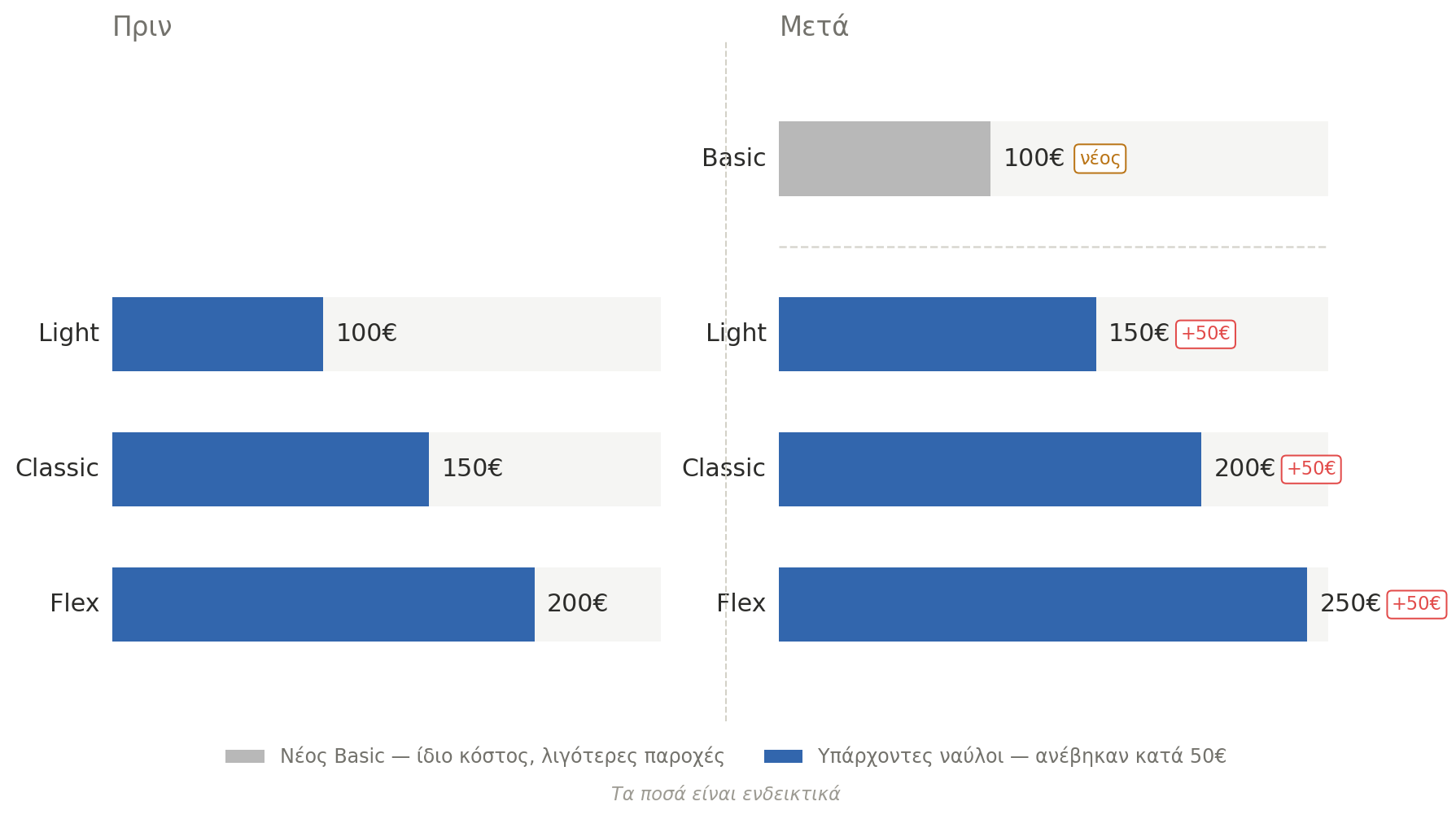 Το κόλπο είναι πολύ απλό: δημιουργούνται νέες κατηγορίες ναύλων, ώστε να μην υπάρχει πλέον σύγκριση με τις προηγούμενες. Ας υποθέσουμε ότι σήμερα οι κατηγορίες ναύλων είναι Light, Classic και Flex, με κόστος 100€, 150€ και 200€ αντίστοιχα για ένα συγκεκριμένο δρομολόγιο. Τα ποσά είναι εντελώς ενδικτικά, μόνο για το παράδειγμα. Η εταιρεία εισάγει έναν νέο ναύλο Basic, απογυνωμένο από σχεδόν τα πάντα, τον βάζει ως πρώτη επιλογή στα 100€, δηλαδή στην τιμή που είχε πριν ο ναύλος Light, και αυξάνει αντίστοιχα τις τιμές όλων των υπόλοιπων ναύλων. Κάπως έτσι όπως στο παρακάτω διάγραμμα: