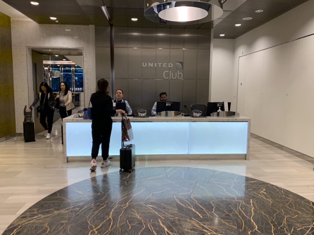 Ανεβαίνοντας με το ασανσέρ βρίσκεστε στη ρεσεψιόν του United Club και μετά από τον έλεγχο της κάρτας επιβίβασης εισέρχεστε στο lounge από την αριστερή πλευρά.